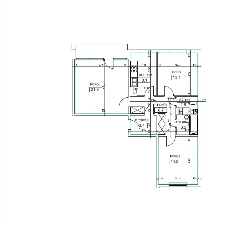 Mieszkanie składa się z trzech ustawnych pokoi, oddzielnej kuchni, łazienki i osobnej toalety.